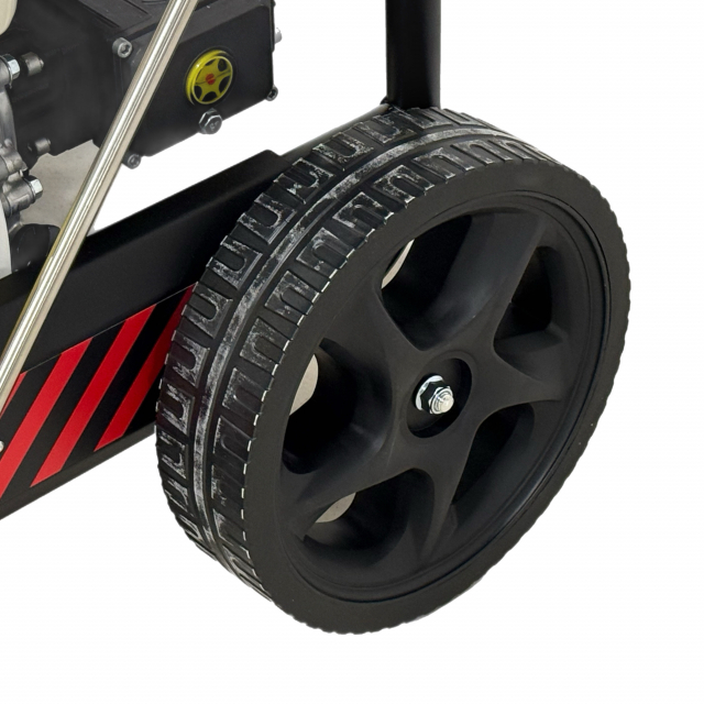 Robuust ontwerp: gepoedercoat stalen frame met grote rubberen wielen – stabiel en terreinwaardig